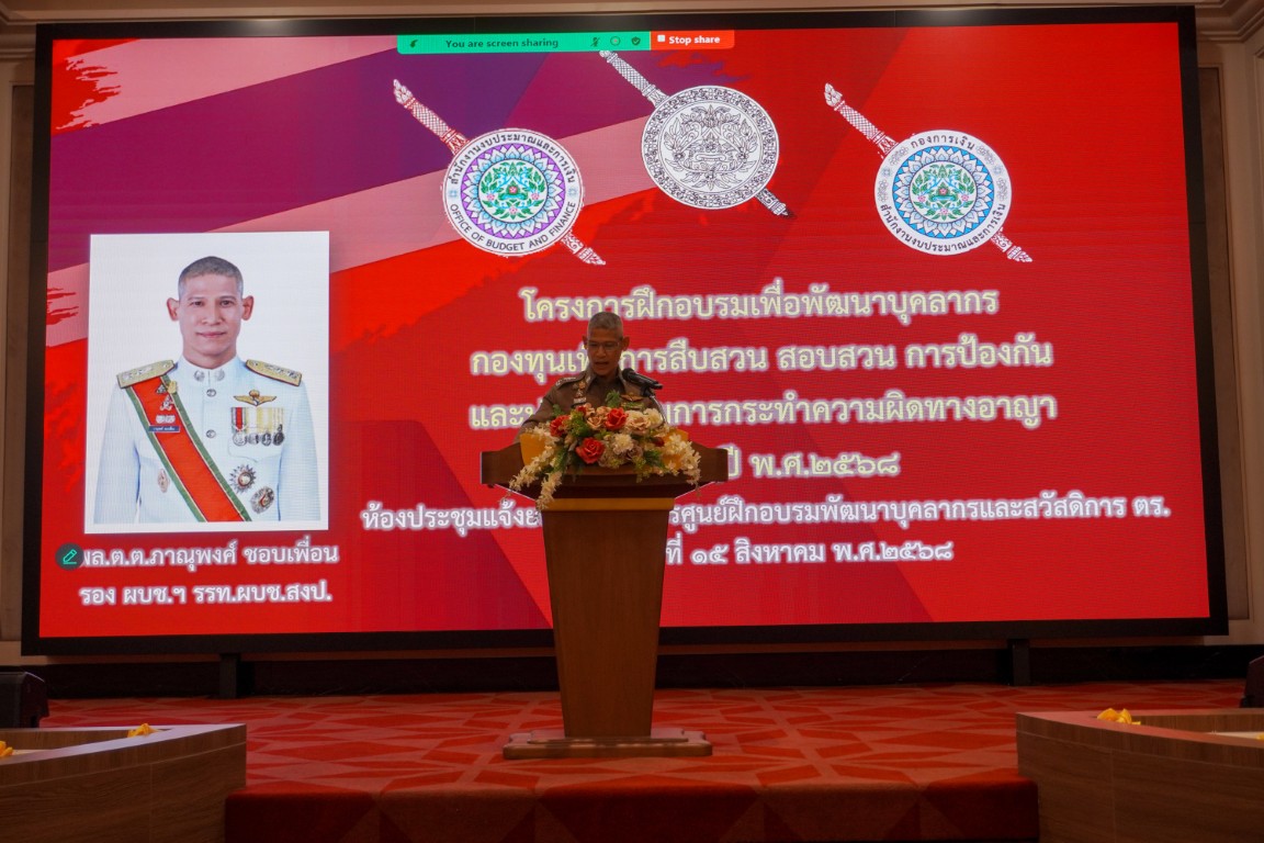 ววันศุกร์ที่ 15 ส.ค.68 เวลา 08.00 – 17.00 น. พล.ต.ต.ภาณุพงศ์ ชอบเพื่อน รอง ผบช.ฯ รรท.ผบช.สงป. เป็นประธาน พิธีเปิดโครงการฝึกอบรมเพื่อพัฒนาบุคลากรกองทุนเพื่อการสืบสวน สอบสวน การป้องกันและปราบปรามการกระทำความผิดทางอาญา